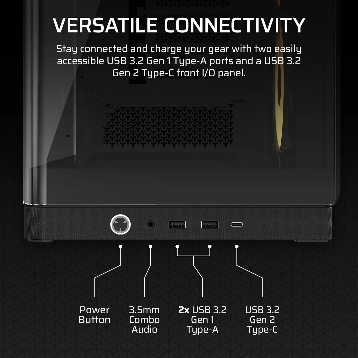 Conectividad moderna y almacenamiento versátil. Disfruta de dos bahías de 2,5" y una de 3,5" para optimizar la velocidad de acceso y la capacidad de almacenamiento. Conecta periféricos y transfiere datos a máximo rendimiento gracias a los dos USB 3.2 Gen 1 Tipo A, un USB 3.2 Gen 2 Tipo C y el jack combo de audio/micrófono.