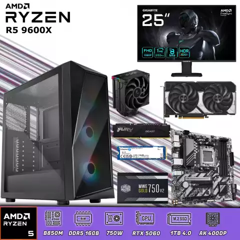 Computador Gamer Ryzen 9000. Cuenta con el novedoso procesador AMD Ryzen 5 9600X, 16 GB DDR5, SSD 1 TB 4.0 de alta velocidad, video RTX 5060 8 GB, Monitor Gamer de 24.5" a 200 Hz.