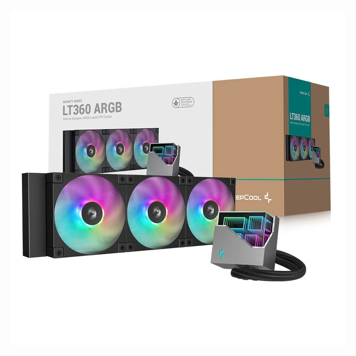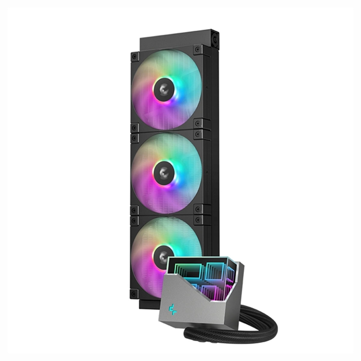 El LT360 ARGB es un refrigerador líquido de CPU de alto rendimiento que se ha actualizado a la bomba de 5ª generación de DeepCool, que encabeza las listas de éxitos, y proporciona una gran potencia de disipación de calor con un radiador de 360 mm, tres ventiladores FD12 ARGB ajustados con precisión y una tapa superior de espejo infinito multidimensional