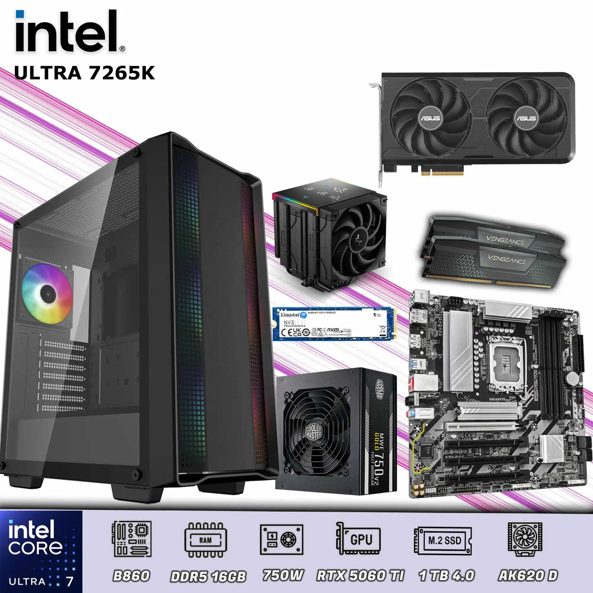 PC Gamer / Workstation con Intel Core Ultra 7 265K (20 núcleos, hasta 5.5GHz), 16GB DDR5 5200MHz y SSD NVMe Gen4 de 1TB. Incorpora RTX 5060 Ti ASUS Dual EVO 16GB GDDR7 OC para gaming avanzado y creación de contenido. Incluye refrigeración DeepCool AK620 Digital Pro, fuente 750W 80+ Gold modular