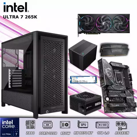 CPU potente y equilibrada con Intel Core Ultra 7 265K, 32 GB de memoria DDR5, SSD PCIe 4.0 de alta velocidad y tarjeta gráfica RX 9070 XT de 16 GB. Diseñada para ofrecer un rendimiento excepcional en juegos de última generación y aplicaciones creativas exigentes