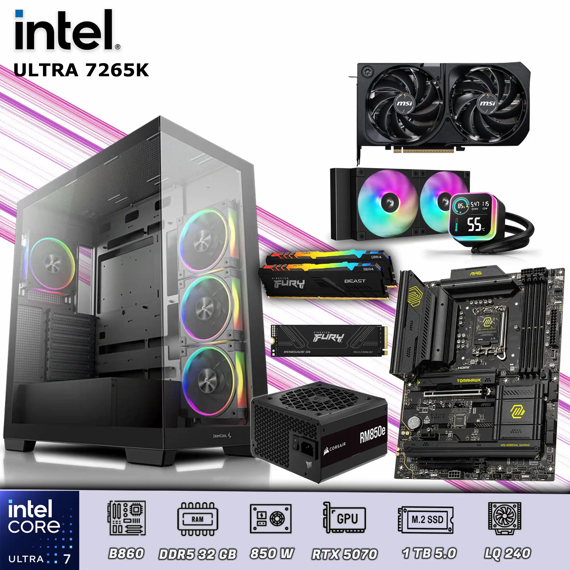 La refrigeración líquida DeepCool LQ240 con display LCD mantiene el procesador en temperaturas óptimas bajo carga, mientras que la fuente Corsair RM850e 850 W 80+ Oro Full Modular asegura eficiencia y estabilidad eléctrica.