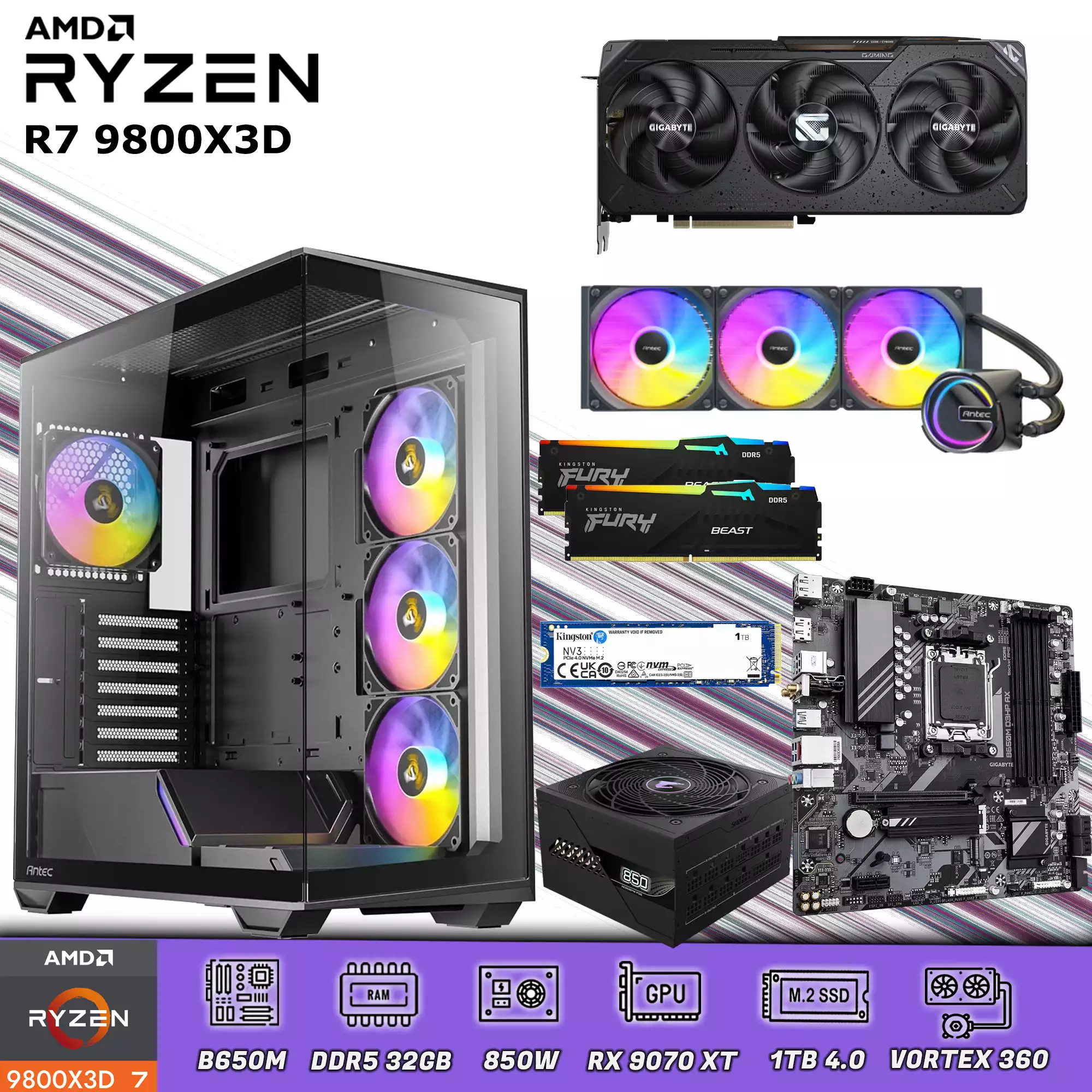 Configuración gamer AMD Ryzen 9800X3D. Configuración perfecta para juegos Triple AAA, diseño gráfico y edición de contenido. Potencia garantizada con fuente de poder de 850 W Gold, DDR5 32 GB a 5600 Mhz, RX 9070 XT, SSD Pcie 4.0 1 TB de alta velocidad y enfriamiento líquido de 360 mm