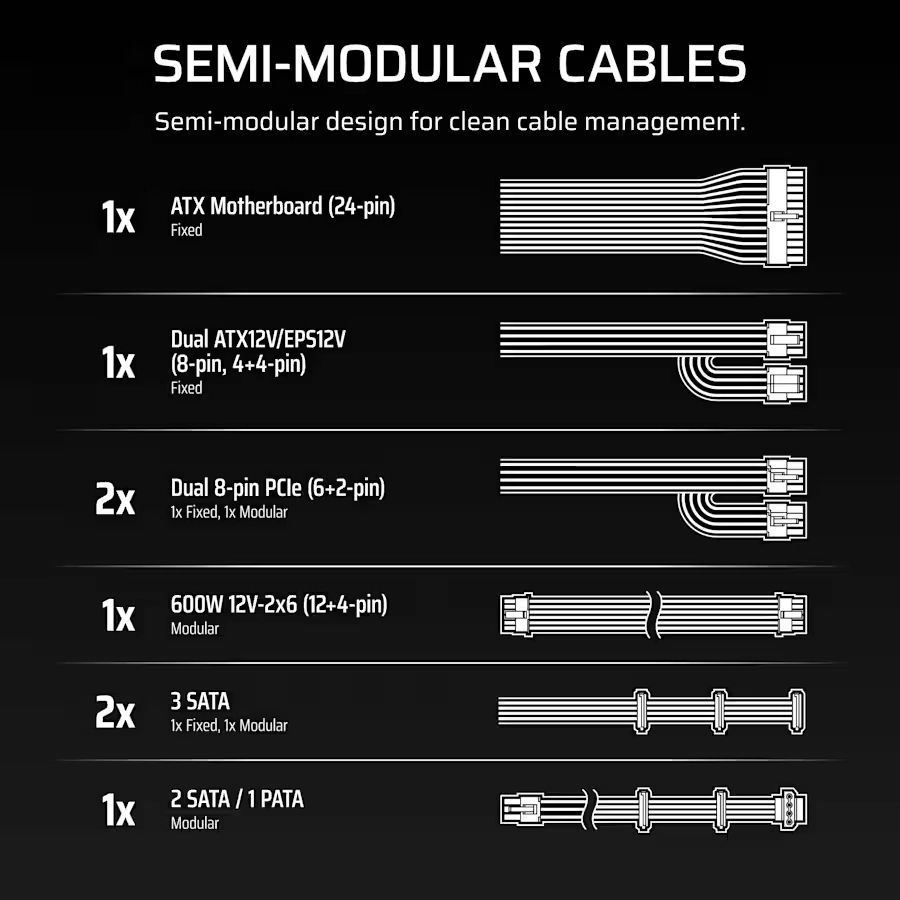Los cables de alimentación que requiere cada montaje ya están conectados y el resto son modulares, así que use solo lo que necesite.