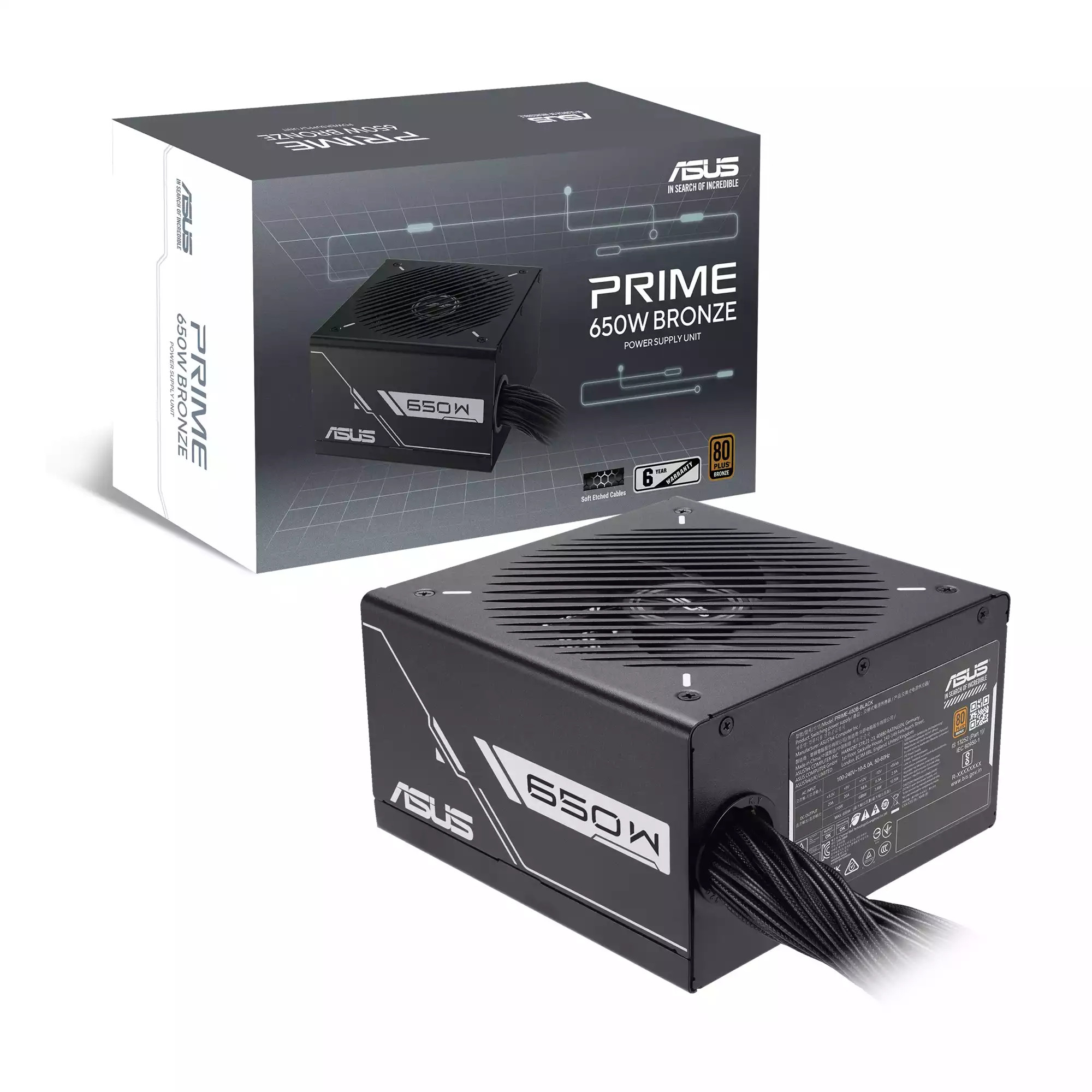 La fuente de alimentación ASUS Prime de 650 W con certificación Bronze proporciona un suministro de energía eficiente y duradero para PC de uso general y equipos para juegos.