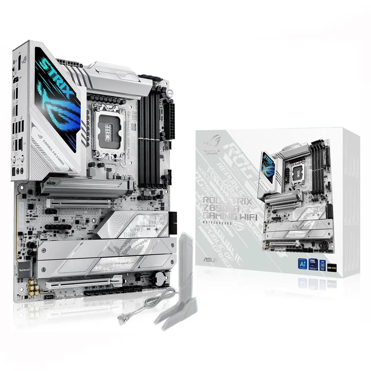 SIN NEGACIÓN ROG STRIX. La ROG Strix Z890-A presenta una elegante superficie blanca que le da un aspecto contemporáneo y elegante que se adapta sin esfuerzo a la mayoría de los sistemas. Los disipadores de calor metálicos complementan el diseño limpio, mientras que la sutil iluminación Polymo en la cubierta de E/S te permite elegir entre un aspecto refinado y minimalista o una pantalla vibrante y llamativa.