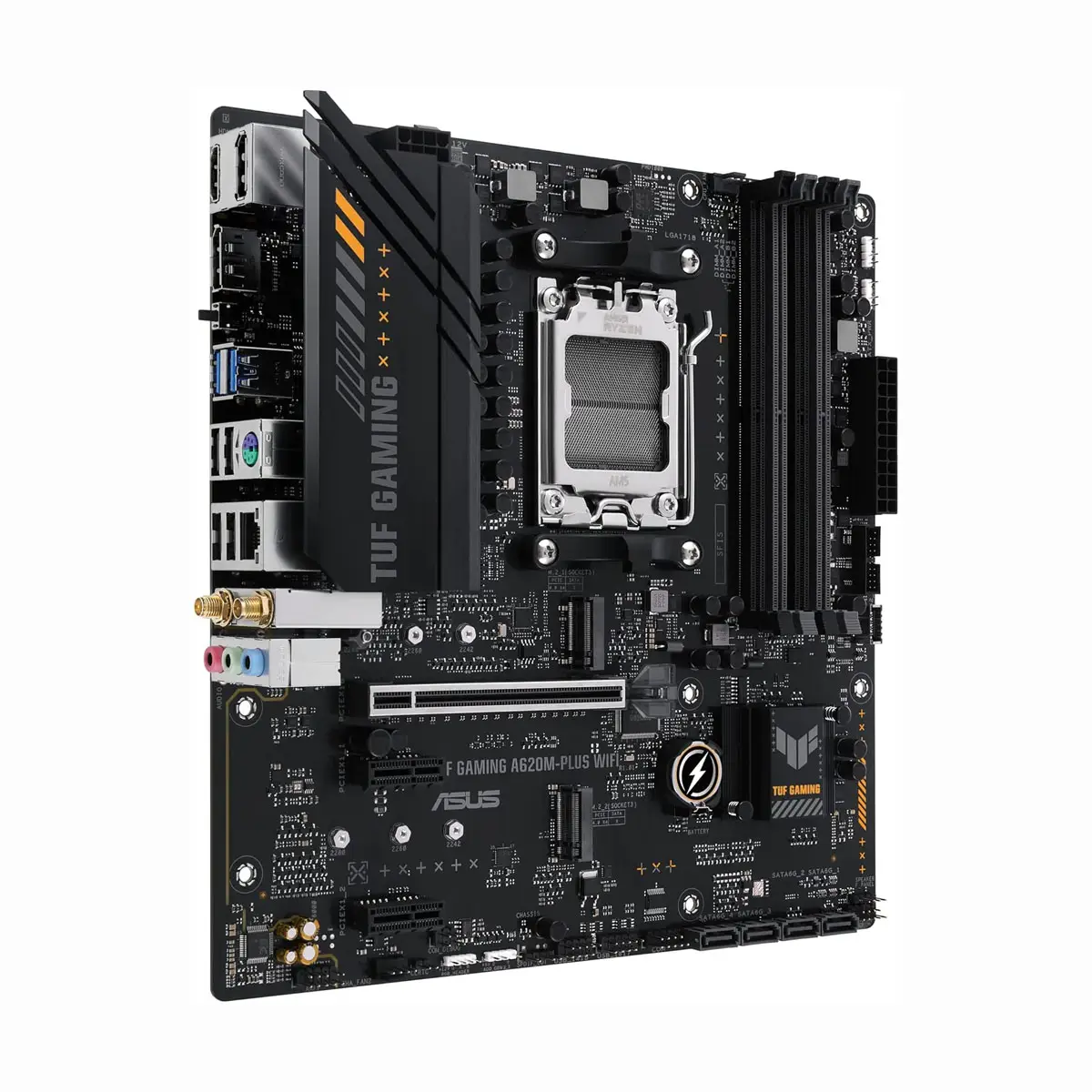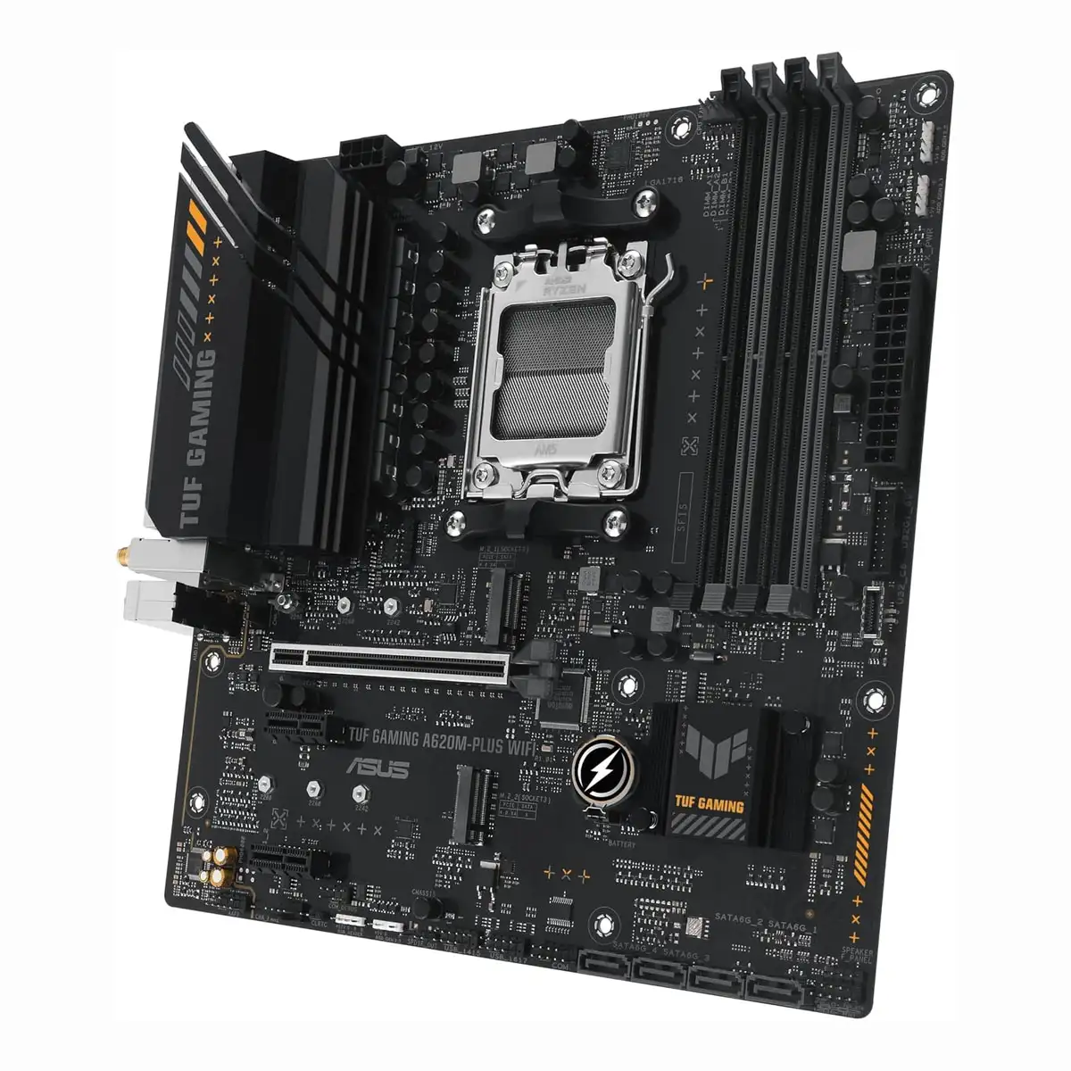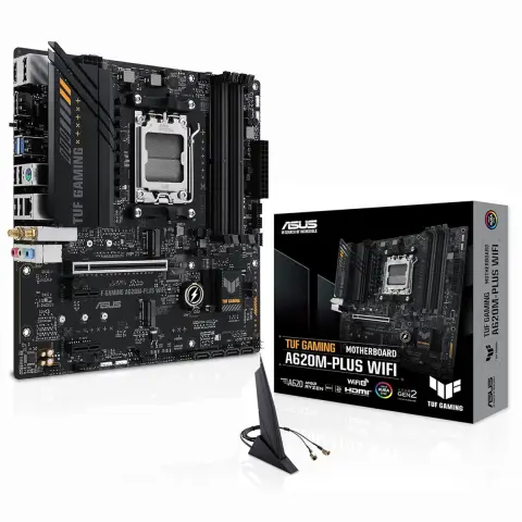 ASUS TUF GAMING A620M-PLUS WIFI toma todos los elementos esenciales de los procesadores de la serie AMD Ryzen 7000 y los combina con funciones listas para jugar y durabilidad comprobada. Diseñada con componentes de grado militar, una solución de alimentación mejorada y un sistema de refrigeración integral, esta placa base supera las expectativas con un rendimiento sólido y estable para juegos de maratón.