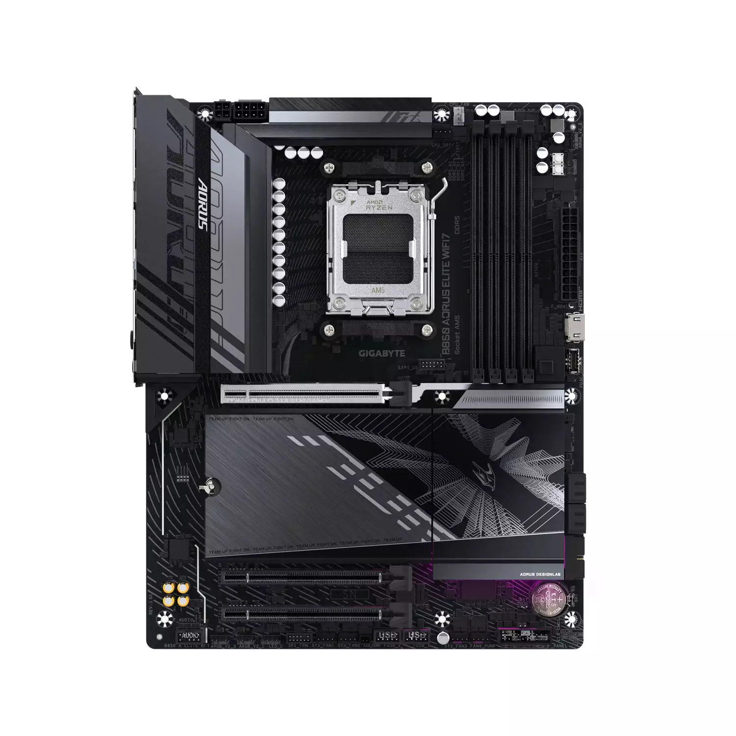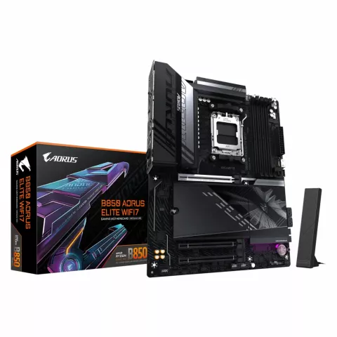 GIGABYTE B850 AORUS ELITE WIFI7 Placa Base - Procesadores AMD Ryzen Serie 9000, VRM digital de 14+2+2 fases, hasta 8200MHz DDR5 (OC), 1xPCIe 5.0 + 2xPCIe 4.0 M.2, LAN 2.5, WIFI 7, USB 3.2 Gen 2x2. Fabricante de procesador: AMD, Socket de procesador: Zócalo AM5, Procesador compatible: AMD Ryzen 7000 Series, AMD Ryzen 8000 Series, AMD Ryzen 9000 Series. tipos de memoria compatibles: DDR5-SDRAM, Memoria interna máxima: 256 GB, Tipo de ranuras de memoria: DIMM. Interfaces de disco de almacenamiento soportados: M.2, SATA III, Tipos de unidades de almacenamiento admitidas: HDD & SSD, Niveles RAID: 0, 1, 10. Máxima resolución: 4096 x 2160 Pixeles. Tipo de interfaz ethernet: 2.5 Gigabit Ethernet, Estándar Wi-Fi: Wi-Fi 7 (802.11be), Wi-Fi estándares: 802.11a, 802.11b, 802.11g, Wi-Fi 4 (802.11n), Wi-Fi 5 (802.11ac), Wi-Fi 6 (802.11ax), Wi-Fi 6E...