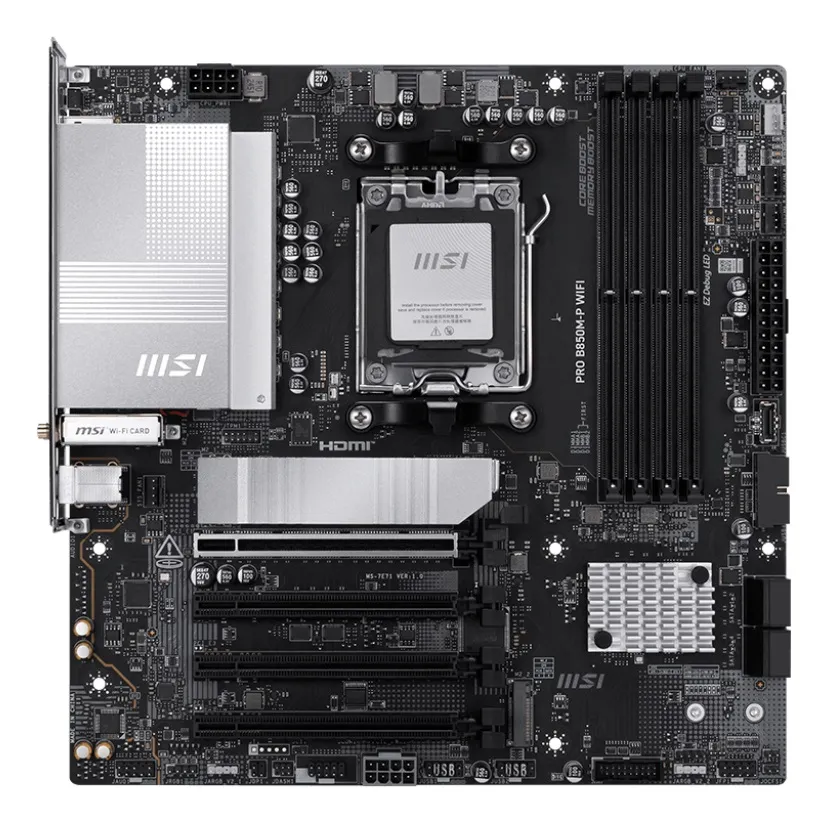 MSI PRO B850M-P WIFI. Fabricante de procesador: AMD, Socket de procesador: Zócalo AM5, Procesador compatible: AMD Ryzen 7000 Series, AMD Ryzen 8000 Series, AMD Ryzen 9000 Series. tipos de memoria compatibles: DDR5-SDRAM, Memoria interna máxima: 256 GB, Tipo de ranuras de memoria: DIMM. Interfaces de disco de almacenamiento soportados: M.2, Tipos de unidades de almacenamiento admitidas: HDD & SSD, Niveles RAID: 0, 1, 10. Tipo de interfaz ethernet: 5 Gigabit Ethernet, Estándar Wi-Fi: Wi-Fi 7 (802.11be), Wi-Fi estándares: 802.11a, 802.11b, 802.11g, Wi-Fi 4 (802.11n), Wi-Fi 5 (802.11ac), Wi-Fi 6 (802.11ax), Wi-Fi 6E.... Componente para: PC, Factor de forma: micro ATX, Familia del chipset: AMD