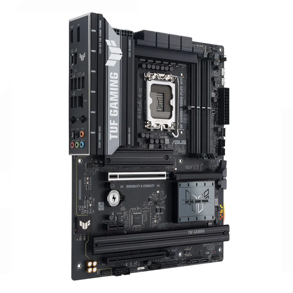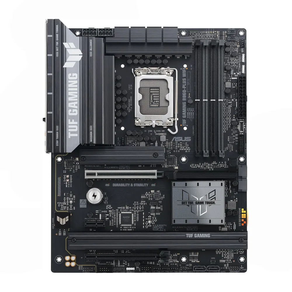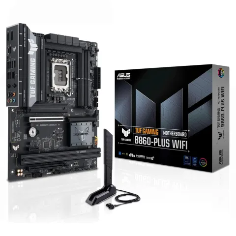 ASUS TUF GAMING B860-PLUS WIFI toma todos los elementos esenciales de los últimos procesadores Intel® Core ™ Ultra (Serie 2) y los combina con características listas para el juego y durabilidad comprobada. Diseñada con componentes de grado militar, una solución de energía mejorada y un sistema de enfriamiento integral