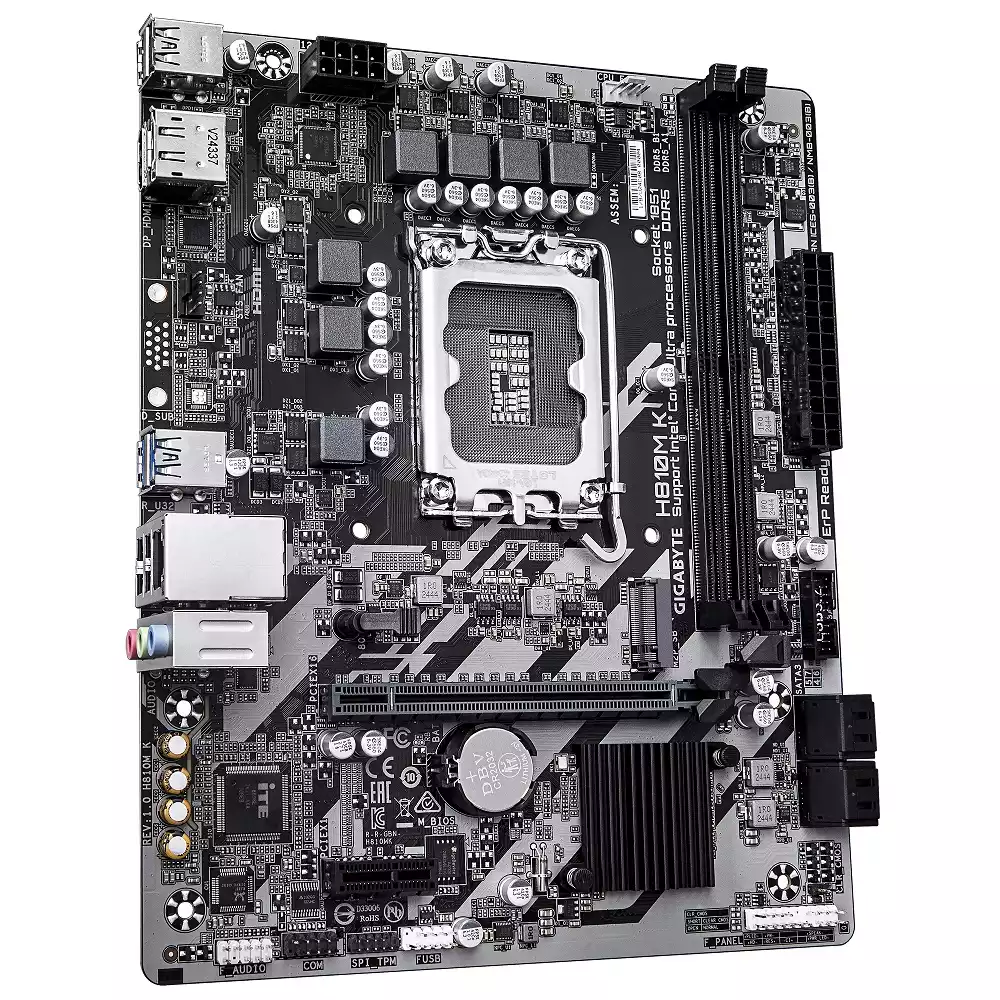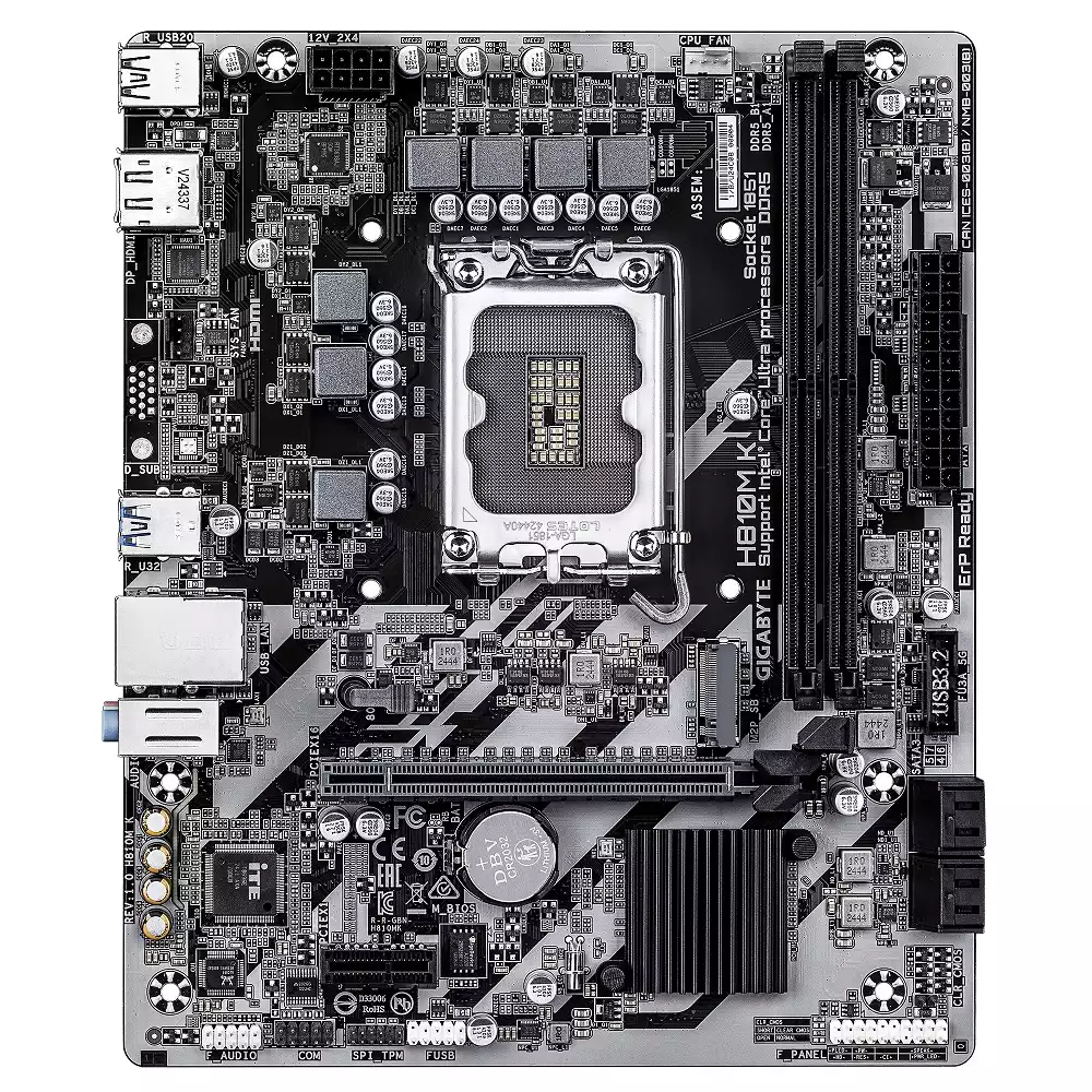 GIGABYTE H810M K Placa Base – Procesadores Intel Core Ultra (Serie 2), VRM de 3+1+2 fases, hasta 6400 MHz DDR5, 1 x M.2 PCIe 4.0, LAN 1 GbE, USB 3.2 Gen 1. Fabricante de procesador: Intel, Socket de procesador: LGA 1851 (Socket V1), Procesador compatible: Intel Core Ultra (Series 2). tipos de memoria compatibles: DDR5-SDRAM, Memoria interna máxima: 128 GB, Tipo de ranuras de memoria: DIMM. Interfaces de disco de almacenamiento soportados: M.2, PCI Express 4.0, SATA III, Tipos de unidades de almacenamiento admitidas: HDD & SSD, Niveles RAID: 0, 1, 5, 10. Máxima resolución: 4096 x 2160 Pixeles. Tipo de interfaz ethernet: Gigabit Ethernet, Controlador LAN: Realtek RTL8111H