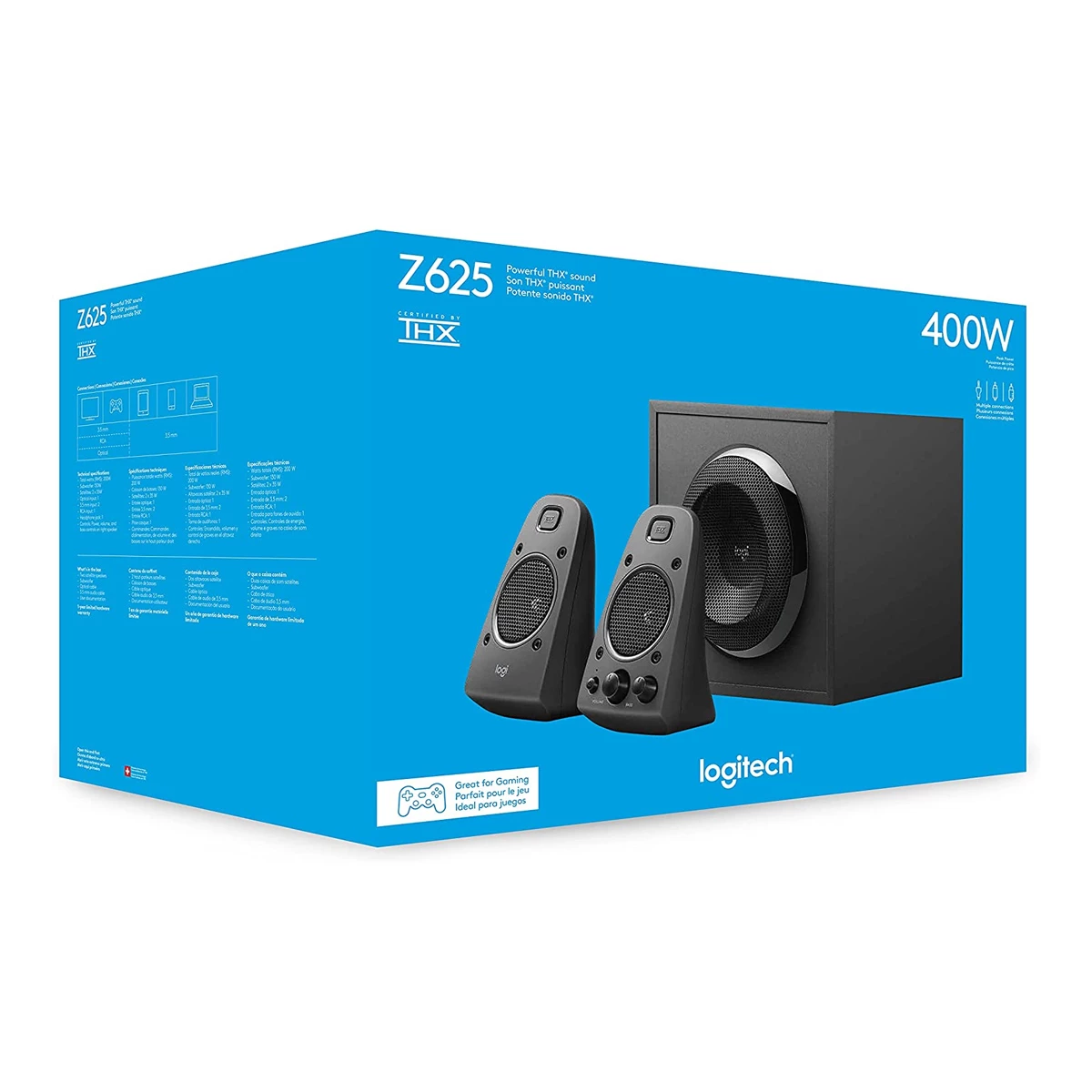 Sistema de altavoces 2.1 con certificación THX® que ofrece audio óptimo para gaming y la experiencia sonora ideal para películas y música. 400 vatios de potencia de pico/200 vatios RMS ofrecen sonido nítido y graves atronadores