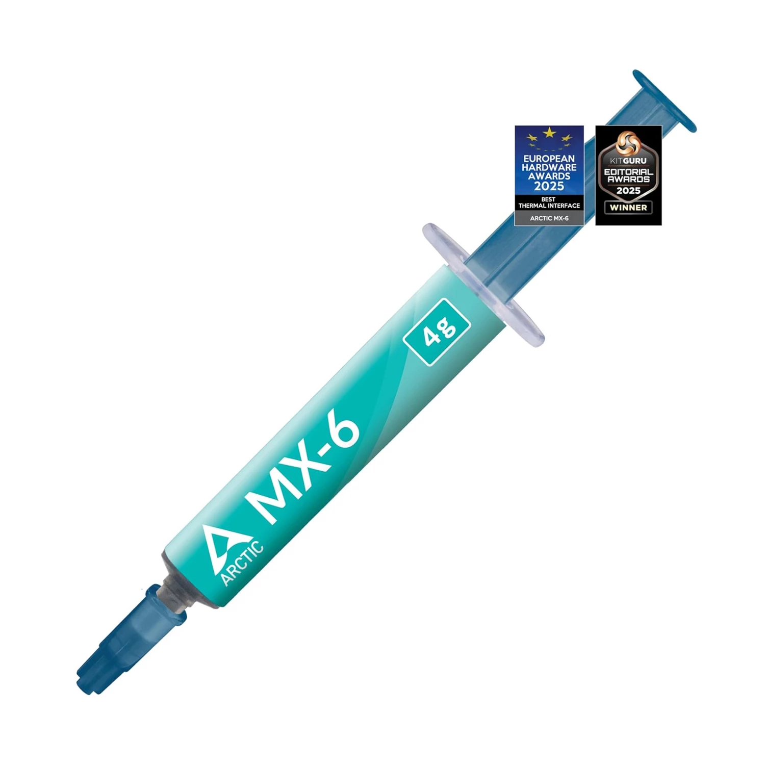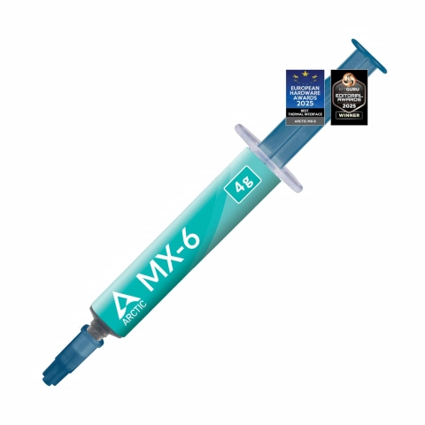El ARCTIC MX-6 es una pasta térmica a base de relleno de carbono y alcanza su máximo rendimiento sin quemaduras, directamente después de la aplicación y distribución. Logra todo esto sin ningún ingrediente reputado, como polvo de diamante costoso o varias partículas de metales preciosos. El gel de silicona utilizado como soporte permite una distribución óptima, que se logra mediante una presión de contacto uniforme, por ejemplo, al montar el disipador de calor.