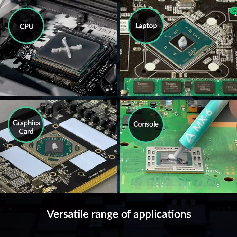 Con su nueva composición, MX-6 es el compuesto térmico adecuado para muchos escenarios de aplicación. Excelentes propiedades que no se secan ni se corren garantizan un rendimiento constante a largo plazo. Su viscosidad evita fugas por el Efecto Pump-Out 🛈 . También es adecuado para escenarios de enfriamiento directo que ocurren, por ejemplo, con tarjetas gráficas o GPU de procesador de consola.
