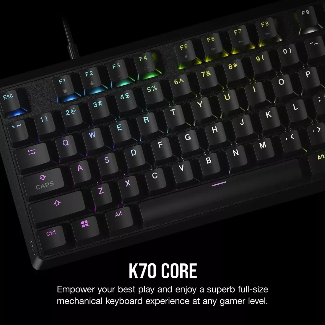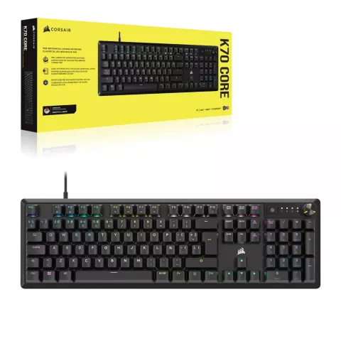 El teclado para juegos CORSAIR K70 CORE le permite dar lo mejor de sí en el juego y convierte la experiencia de jugar y escribir en algo increíble gracias a un control multimedia sin esfuerzo e interruptores lineales CORSAIR MLX Red.