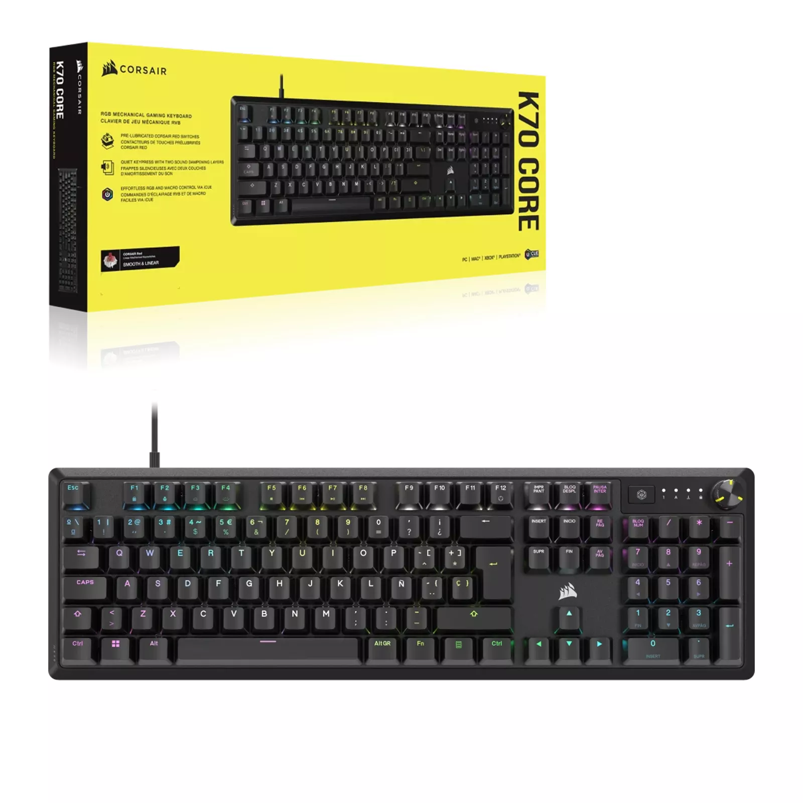 El teclado para juegos CORSAIR K70 CORE potencia su mejor juego y hace que jugar y teclear sea increíble. Con interruptores mecánicos lineales CORSAIR Red suaves como la seda y dos capas de espuma de amortiguación de sonido para ofrecer un sonido y una sensación de tecleo superiores, esto es rendimiento CORSAIR de primer nivel en estado puro. Tome el control sin esfuerzo con un dial giratorio multifunción y un botón multimedia programable, configurables mediante iCUE.