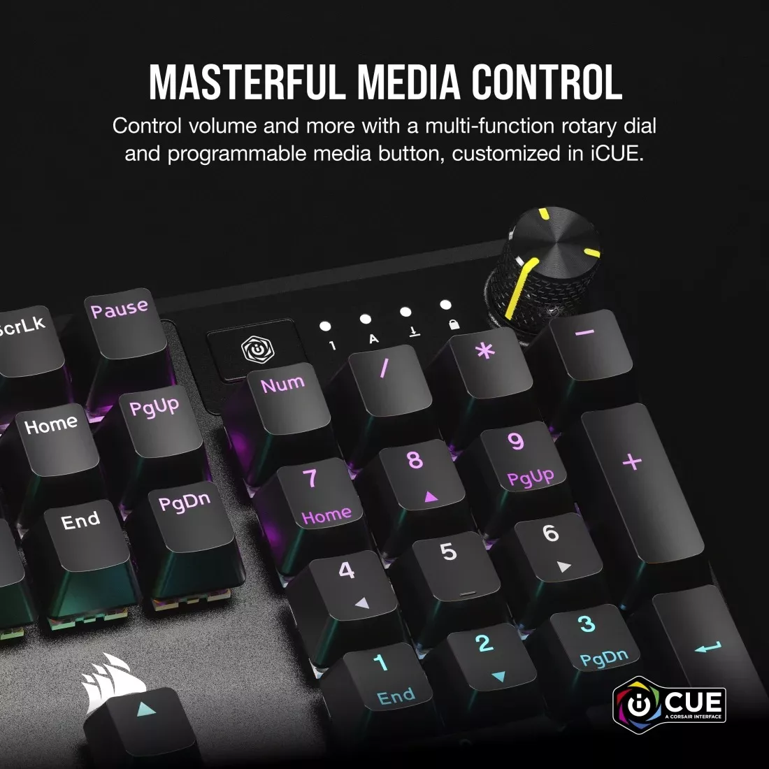 Personalice su teclado en iCUE: Tome el control con CORSAIR iCUE, que le permite personalizar la intensa iluminación RGB dinámica, reasignar teclas y programar el botón multimedia