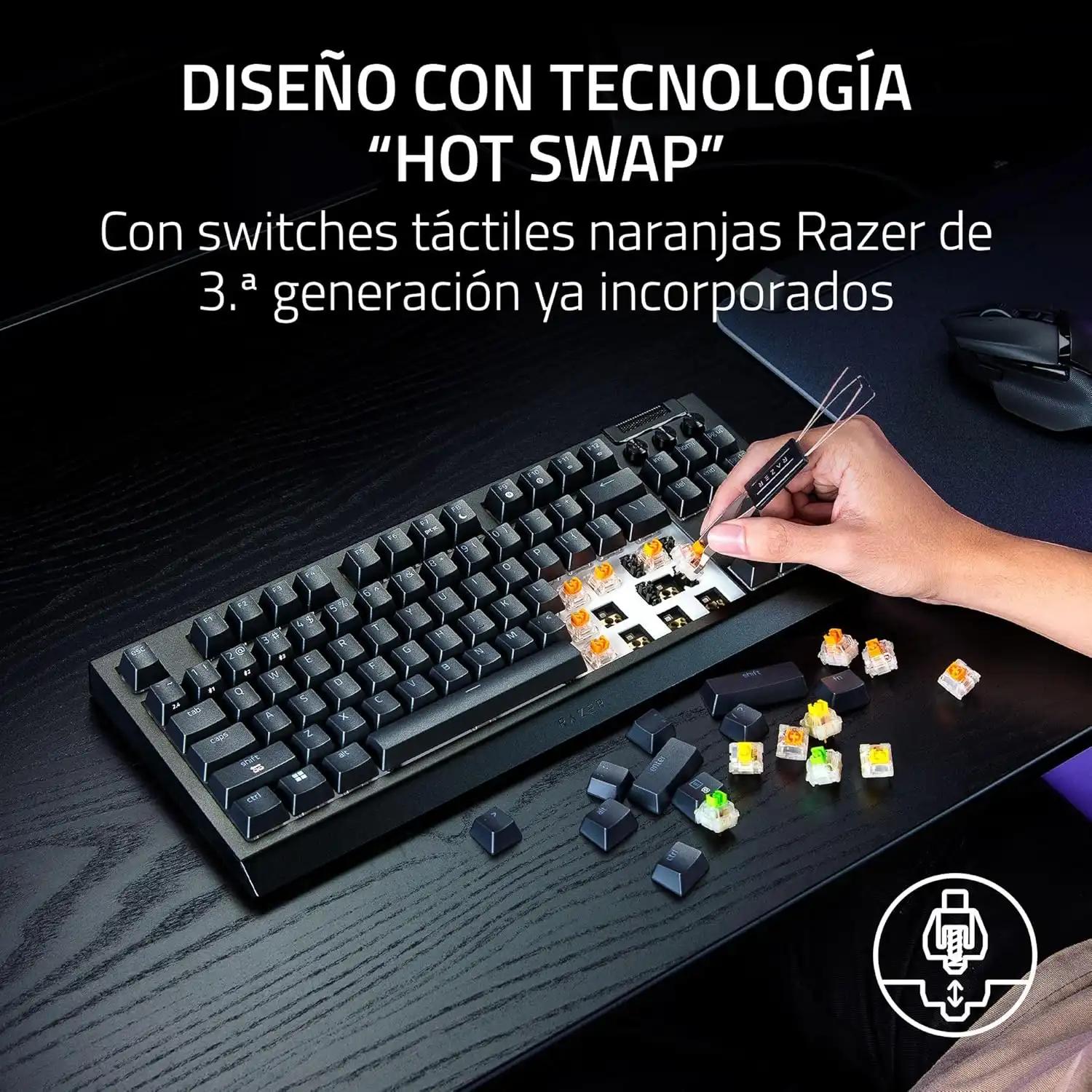 Diseño con tecnología “hot swap” - con switches táctiles naranjas Razer de 3ª generación ya incorporados: Compatible con switches de 3 o 5 pines, la PCB con base del teclado te permite cambiar fácilmente sus switches instalados por otros personalizados para conseguir la sensación de tecla que desees.